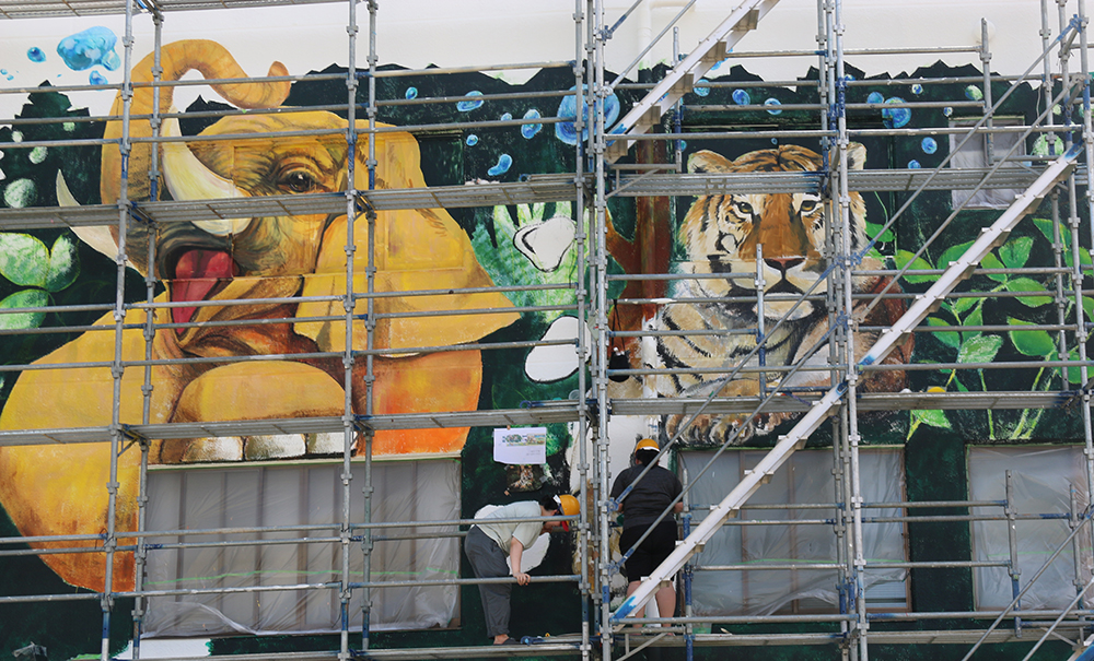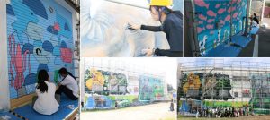現在、同市内の森田設備開発(宗像市徳重163-1)にて、同学科黄禧晶(ファンヒジョン)教授指導のもと学生20名と卒業生8名が、ウォールアートの制作に取り組んでいます。同祭へ初参加となる学生たちは、建物の壁面を大きく使ったメイン壁画を中心に、地域の文化や風土に触れながら、4日間にわたる現地制作に挑んでいます。