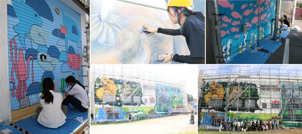 9月7日(日)には、地元の子どもたちを対象としたウォールアートのワークショップを開催。学生たちは子どもたちと一緒に絵を描きながら、アートの楽しさや表現の自由さを共有し、地域との交流を深めました。同ワークショップでは、子どもたちが描いた絵画作品482点の中から選ばれた作品をもとに、建物のアプローチ部分やシャッターに描く展開となっており、メイン壁画と並行して学生たちが制作を進めています。