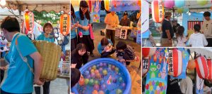 今年も学生が企画・準備を行い、「射的屋」「ヨーヨーすくい」「ボールすくい」「玉入れ」の4つを出店。「八朔大祭」のポスターや店看板のデザインなは造形短期大学部の学生が担当しました。地域住民や行政区、自治体の方々との交流もでき、貴重な体験になったようです。